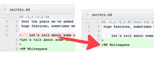 在任意diff页面的URL后加上?w=1,可以去掉那些只是空白字符的变化,使你能更专注于代码的变化。